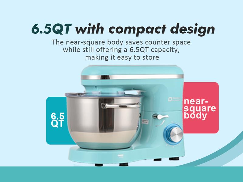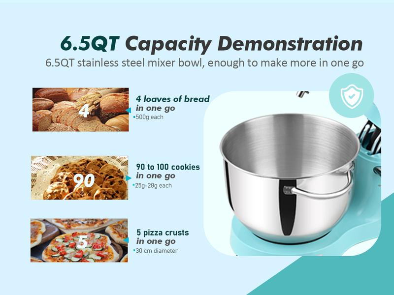 - 6.5QT Large Capacity BowlOur stand mixer comes with a 6.5QT food-grade stainless steel bowl, perfect for handling large quantities of food without the need for multiple batches. Dual handles and an integrated splash guard make it easy to hold and clean.
