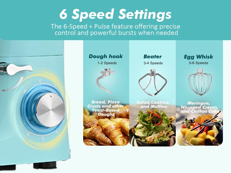 - 6-Speed Pulse Control & Tilt-Head DesignThis kitchen mixer features 6-speed control for precision, from slow stirring to fast mixing. The pulse function reaches maximum speed in a second, perfect for whipping egg whites. The tilt-head design allows for easy installation or removal of the bowl and attachments.