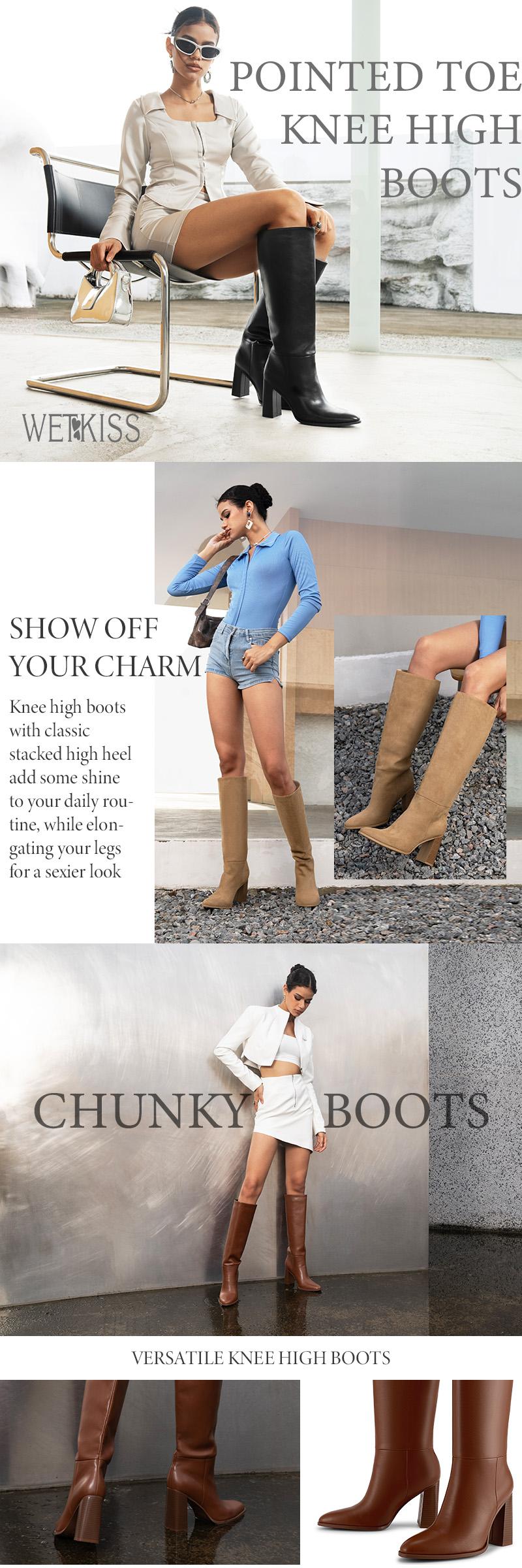 Wetkiss Pointed Toe Knee High Boots Women Chunky Heel Wide Calf Pull on Tall Boots for Work Date Dress Party Club Shoes Footwear Girl #Tiktokshopbacktoschool